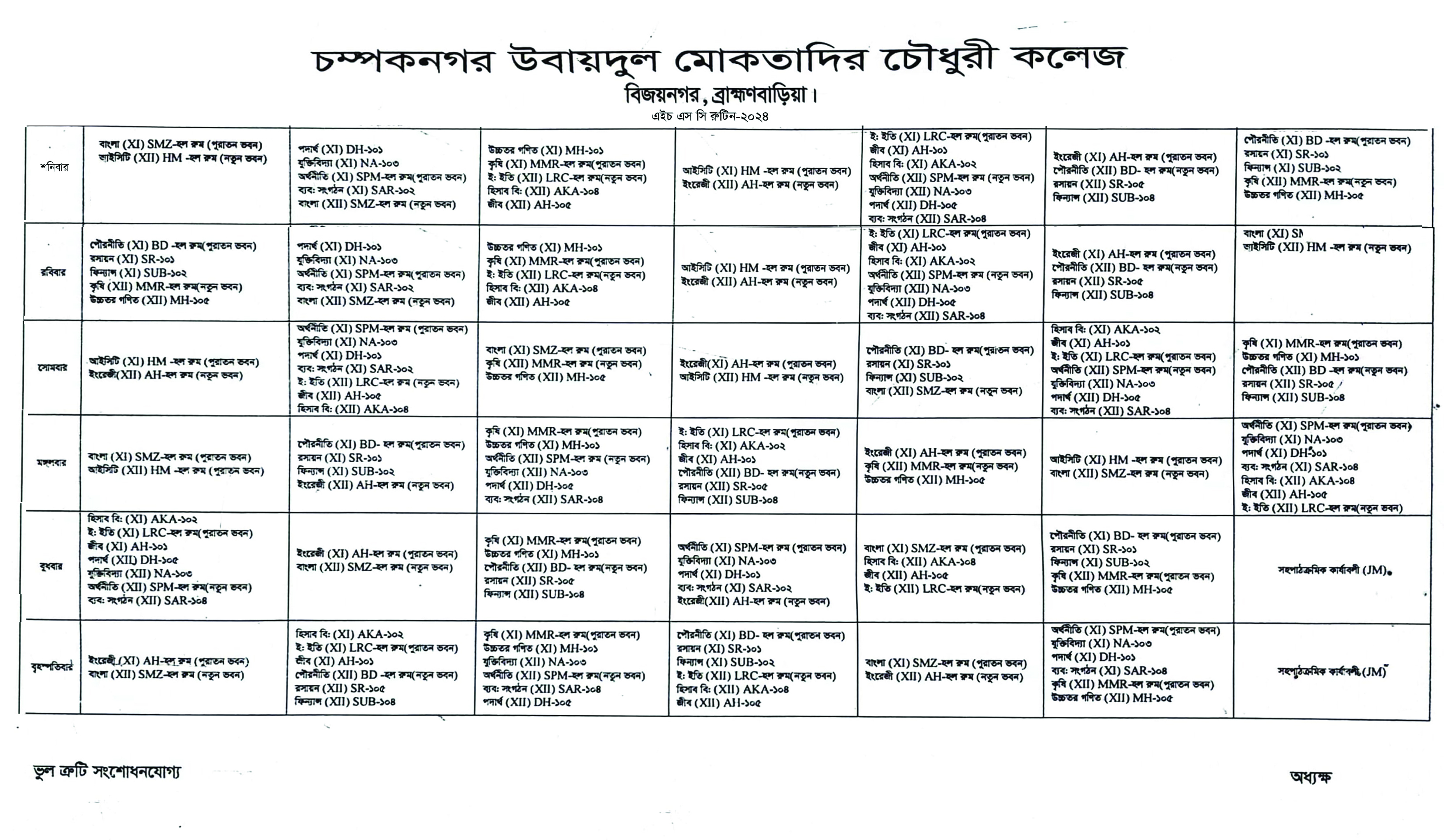 একাদশ ও দ্বাদশ শ্রেণির ক্লাস রুটিন