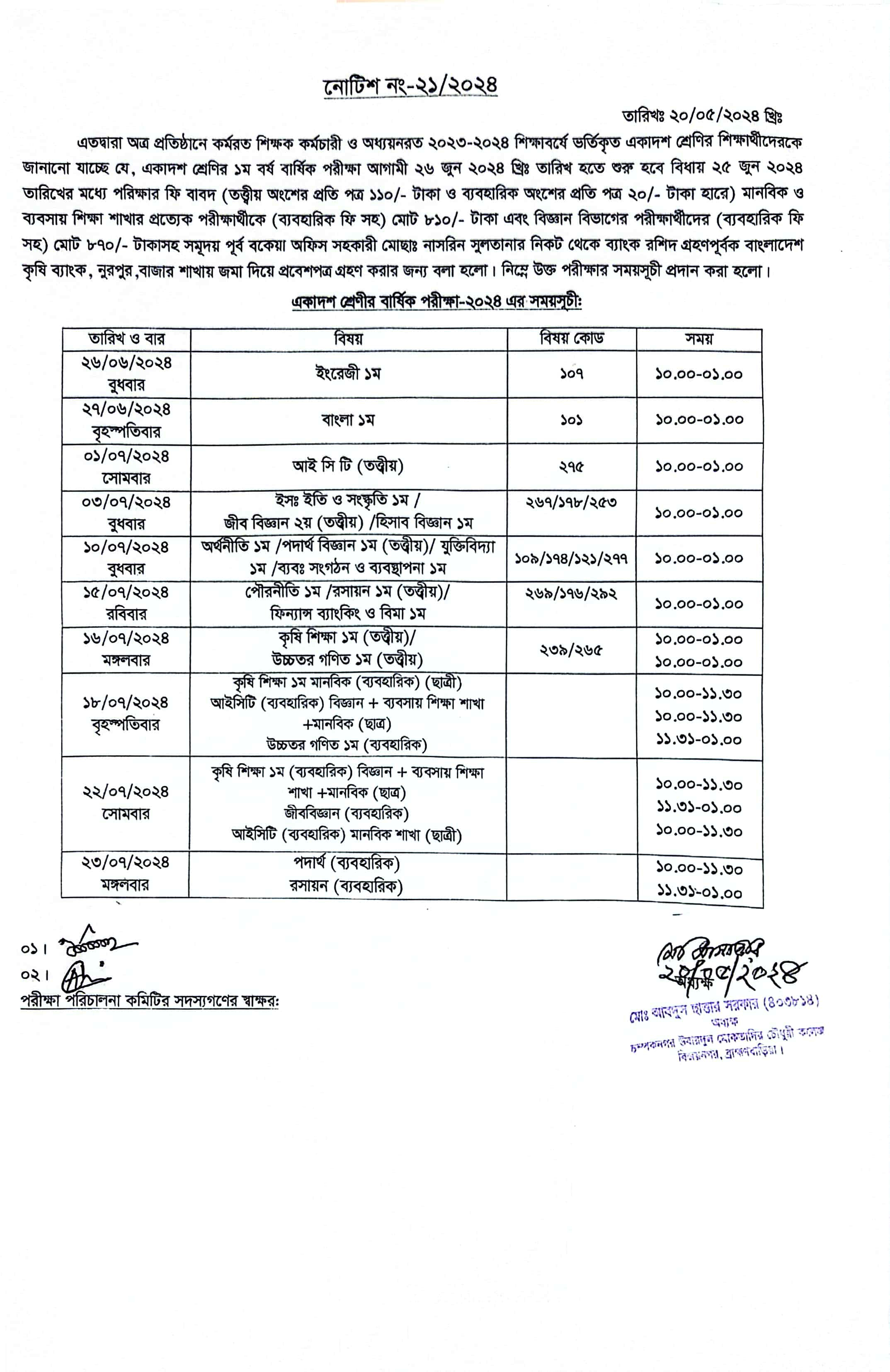 একাদশ শ্রেণির বার্ষিক পরীক্ষা-2024